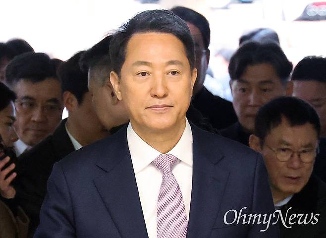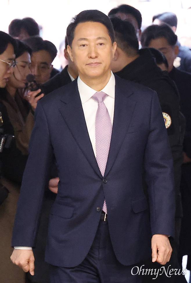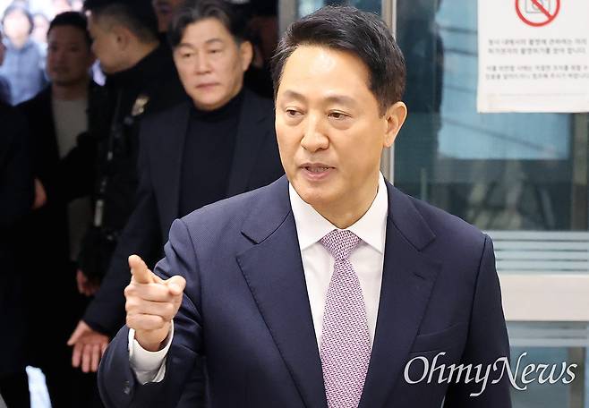 오세훈 서울시장이 4일 오전 서울 서초구 서울중앙지법에서 열린 '명태균 여론조사 의혹' 사건 1심 공판에 출석하고 있다.