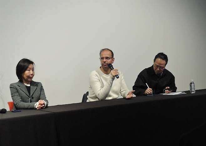 | ▲ 티노 세갈 작가(가운데)와 '질의응답' 시간의 인터뷰 장면. '김성원' 리움미술관 부관장(왼쪽) |