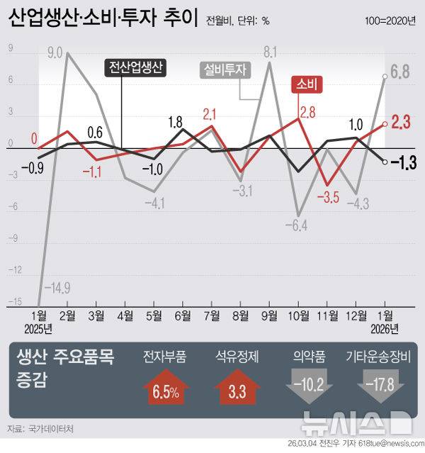 [서울=뉴시스] 4일 국가데이터처에 따르면 지난달 전산업생산은 전월 대비 1.3% 감소했다. 호조를 보이던 반도체 등 제조업이 주춤하면서 산업생산은 석 달 만에 다시 마이너스로 돌아섰다. 반면 소비와 설비투자는 큰 폭으로 증가했다. (그래픽=전진우 기자)