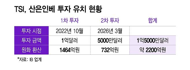 4일 투자은행(IB) 업계에 따르면 산은인베스트먼트는 TSI에 대한 5000만달러(약 732억원) 투자를 최근 확정했다. 앞서 2022년 10월 1억달러(1464억원)를 집행한 데 이은 후속 투자다.