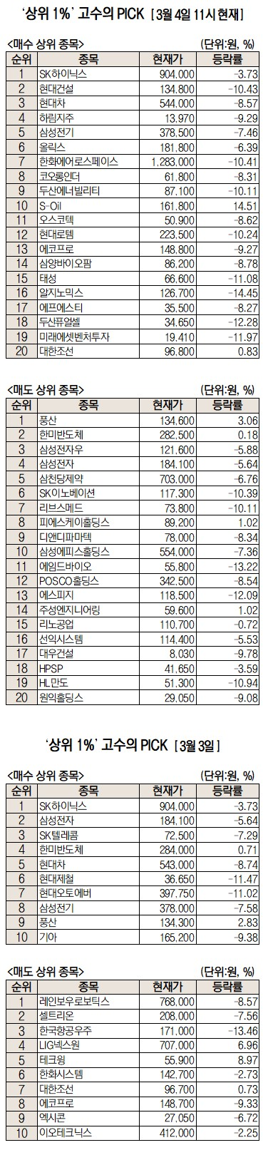 반면 이날 ‘초고수’들의 순매도 상위 종목에는 풍산(+3.06%), 한미반도체(+0.18%), 삼성전자우(-5.88%), 삼성전자(-5.64%), 삼천당제약(-6.76%) 등이 꼽혔다. 전거래일 순매수 상위 종목은 SK텔레콤, SK하이닉스, 에쓰오일 순이었다. 순매도 상위에는 레인보우로보틱스, 셀트리온, LIG넥스원이 있었다.
