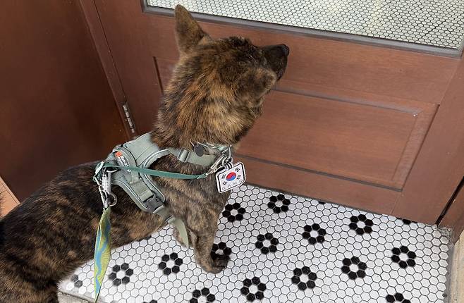 | ▲ 반려견 가호가 평소에 즐겨 가던 카페 문 앞에서 들어가고 있지 못하는 모습. 역설적으로 그간 반려동물을 알음알음 허용해왔던 일부 식당과 카페들이 반려동물 동반 출입이 가능해진 지난 1일부터 여러 규정으로 인해 반려동물 출입을 허가하지 않고 있다. |