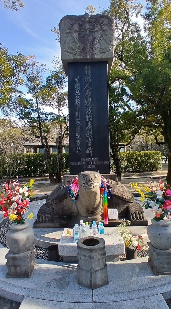 | ▲ 히로시마 평화공원 내 한국인 위령비 1970년 추모비 건립 당시 공원 바깥에 세워졌다가 재일동포들과 일본 시민들의 지속적인 요구로 1999년에서야 지금의 위치(히로시마 평화공원 내)로 들어왔다. |