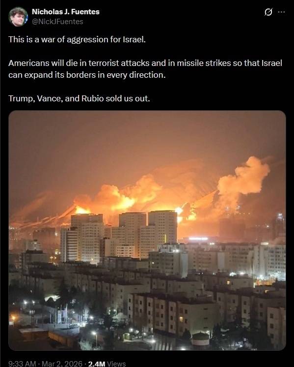 | ▲ 120만 명의 팔로워를 지닌 마가 인플루언서 닉 푸엔테스는 "이번 공습은 이스라엘의 침략 전쟁이다. 이스라엘이 사방으로 영토를 확장할 수 있도록 미국인들이 테러 공격과 미사일 공격으로 목숨을 잃을 것"이라며 "트럼프, 밴스, 그리고 루비오는 우리를 배신했다"라고 맹비난했다. |
