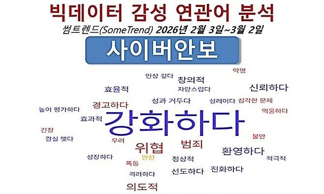 빅데이터 심층 분석 도구인 썸트렌드(SomeTrend)의 ‘사이버 안보’ 빅데이터 감성 연관어 분석 자료(2026년 2월 3일~3월 2일)에서 ‘강화하다’라는 단어가 압도적인 비중을 차지하는 것은, 단순히 방어력을 높이는 차원을 넘어 사이버 정보 역량이 국가 안보의 핵심 공격 수단으로 진화했음을 시사한다.