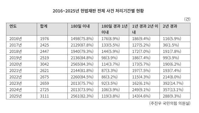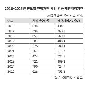 4일 주진우 국민의힘 의원실이 헌법재판소로부터 제출받은 자료에 따르면, 2025년 헌재의 지정재판부(3인으로 구성된 사전심사부)가 각하한 사건을 제외한 본안 사건 628건의 평균 처리기간은 753.2일(약 2년 1개월)로 집계됐다. 이는 전년(724.7일)보다 약 30일 늘어난 수치다.