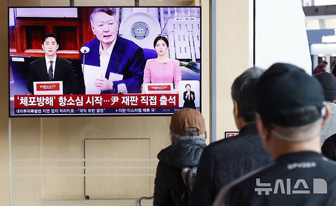 [서울=뉴시스] 김혜진 기자 = 4일 서울 중구 서울역 대합실에서 시민들이 윤석열 전 대통령의 '공수처 체포 방해' 및 '국무위원 심의권 침해' 2심 관련 뉴스를 시청하고 있다. 2026.03.04. jini@newsis.com