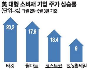 다른 미국 주요 대형 유통기업도 주가가 강세를 보이고 있다. 코스트코·월마트·비제이스홀세일 등의 주가는 올해 들어 각각 13.4%, 17.9%, 9% 상승했다. 같은 기간 S&P500과 나스닥 등 미국 주요 지수가 박스권에서 등락을 거듭하는 것과 비교하면 선방하고 있다는 평가다. 이들 기업 주가는 전쟁 쇼크가 덮친 이번주에도 지속적으로 상승하고 있다.