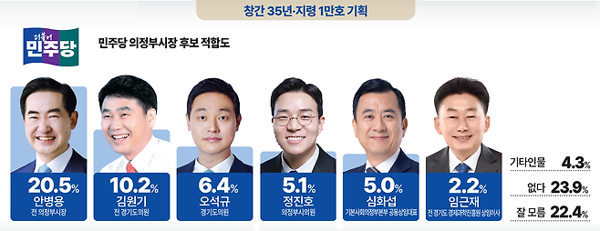4일 중부일보 의뢰로 여론조사기관 ㈜데일리리서치가 의정부시 거주 만 18세 이상 남녀 501명을 대상으로 지난 2일부터 3일까지 이틀간 실시한 여론조사 결과(95% 신뢰수준에 오차범위 ±4.4%p)에 따르면 '더불어민주당 의정부시장 후보로 가장 적합한 인물은 누구인가'라는 질문에 20.5%가 안병용 전 시장을 선택했다.