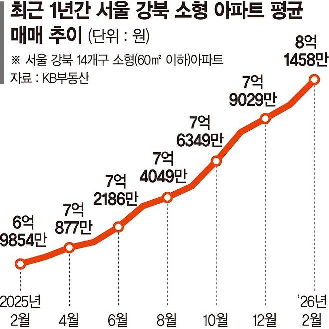 4일 KB부동산에 따르면 올해 2월 기준 서울 강북 14개구(종로·중·용산·성동·광진·동대문·중랑·성북·강북·도봉·노원·은평·서대문·마포구)의 소형 아파트(전용 60㎡ 이하)의 평균 매매 가격은 8억1458만원으로 집계됐다. 1년 전인 지난해 2월 6억9854만원보다 16.61%(1억1604만원) 상승한 것이다.