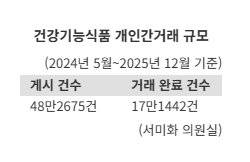 4일 국회 보건복지위원회 소속 서미화 더불어민주당 의원실이 식품의약품안전처로부터 제출받은 '건강기능식품 개인간거래 규모' 자료에 따르면 시범사업이 시작된 2024년 5월부터 지난해 12월까지 약 1년 7개월간 건기식 개인간거래는 17만1442건, 거래액은 52억8274만원으로 집계됐다.