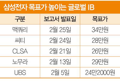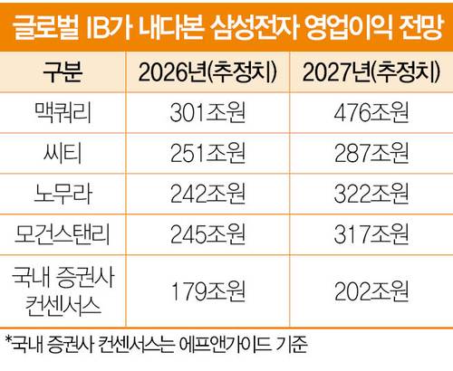 글로벌 투자은행(IB)이 삼성전자의 영업이익 전망치를 잇달아 상향 조정하고 있다. 맥쿼리는 2월 24일 보고서에서 삼성전자의 2026년과 2027년 영업이익을 각각 301조원, 476조원으로 제시했다. 일본 노무라증권도 2월 12일 보고서에서 각각 242조원, 322조원을 내다봤다. 앞서 모건스탠리도 비슷한 전망을 내놨다. 1월 30일(현지 시간) 발간한 ‘메모리-더블 업(Memory-Double Up)’ 보고서에서 삼성전자의 영업이익을 2026년 245조원, 2027년 317조원으로 추정했다. 기존 전망치보다 각각 33%, 31% 높인 수치다.