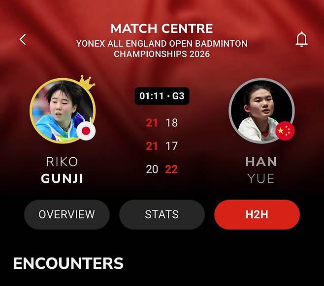 한웨는 4일(한국시간) 영국 버밍엄의 유틸리타 아레나에서 열린 2026 세계배드민턴연맹(BWF) 전영오픈(슈퍼 1000) 여자단식 32강전서 26위 리코 군지(일본)에 1-2(22-20 17-21 18-21)로 역전패 했다.