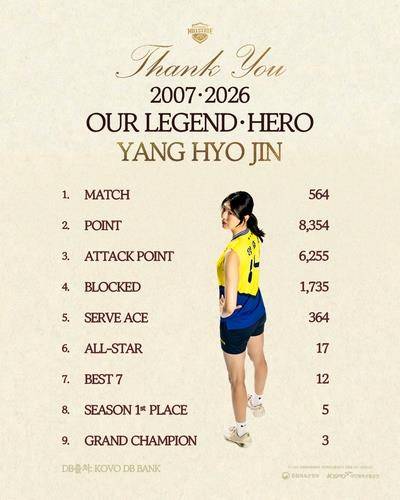 여자 프로배구의 '살아있는 전설'로 불린 베테랑 미들블로커 양효진(37·현대건설)이 19년간 이어온 선수 생활을 마무리한다.