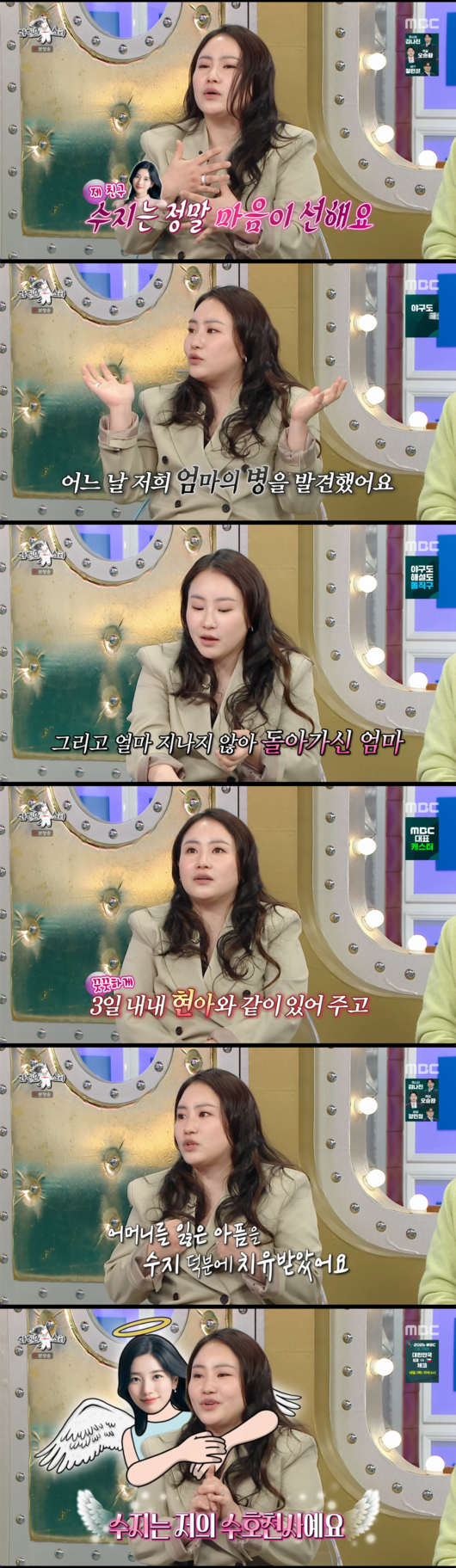 조현아는 수지의 진심 어린 위로 덕분에 어머니를 잃은 큰 아픔을 치유받을 수 있었다고 고백하며 “방송에서 꼭 얘기하고 싶었다. 수지는 저의 수호천사라고” 덧붙이며 고마운 마음을 전했다.