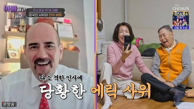 드디어 에릭과의 영상통화 시간. 아버지는 긴장한 모습을 보였다. 에릭이 인사를 하자마자 아버지는 냅다 "땡큐 베리마취"라고 외쳐 보는 이들을 폭소케 했다. 당황한 에릭은 "아이고"라고 화답해 웃음을 더했다. 이후 에릭은 생각보다 수준급의 한국어 실력으로 장인어른과 소통해 훈훈함을 자아냈다.