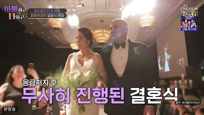 이를 들은 한혜진은 "대단히 티는 안 난다. 워낙 코가 높으셔서"라며 감탄했다. 결혼식은 뮤지컬 갈라쇼 형식으로 진행됐다. 전수경은 "저희는 신랑 어머니, 신부 어머니 둘 다 안 계시니까 쌍둥이 딸들이 화촉을 밝혀줬다. 일반 결혼식과는 다르게 연출을 했다"라고 말했다.
