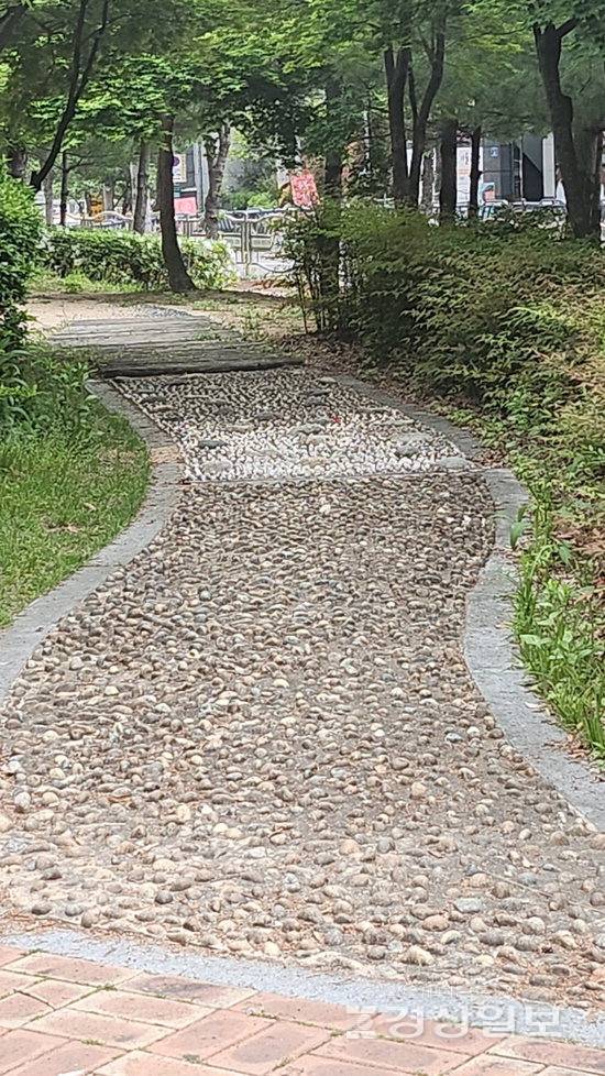 맨발을 이용해 지압을 할 수 있게 자갈들이 공원 길 사이에 깔려있다. 이어 나무도 몇 군데 놓여 있고 대리석도 섞여 있다. 그 옆에는 원형모래구장이 있다. 요즘 어린이공원에서는 보기 드문 부분이었기에 소중하게 다가왔다. 모래 위에 글도 쓰고 그림도 그리면서 재미있는 시간을 보낼 수 있을 것 같다. 원형모래구장은 지압 길 옆에도 있었고 운동기구가 있는 앞에도 있었다. 아이들이 노는 것을 보면서 어른들이 운동기구를 이용하도록 위치가 적당했다.