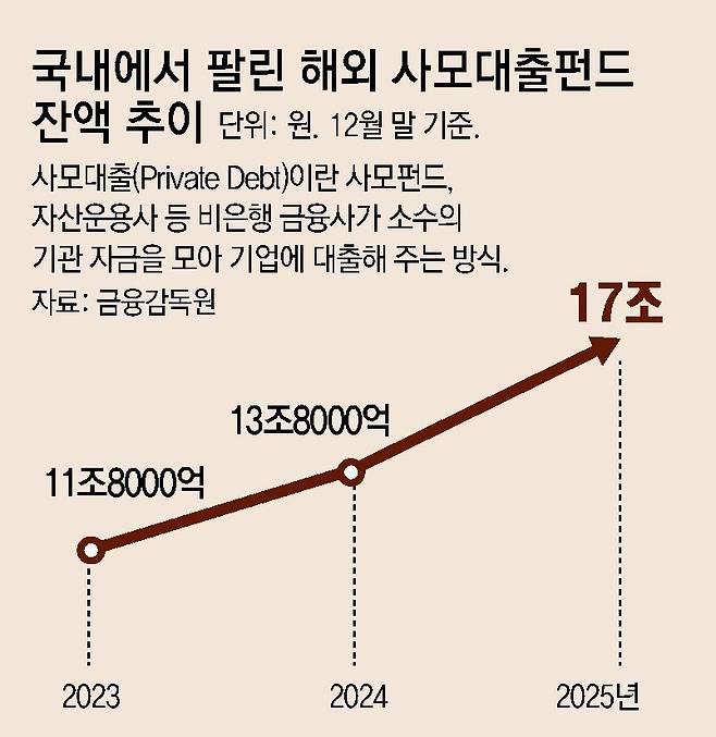 국내 금융당국은 사모대출 동향을 예의 주시하고 있다. 연기금, 공제회 등 기관투자가를 비롯해 일부 개인도 관련 펀드를 갖고 있기 때문이다. 금감원에 따르면 지난해 말 기준 국내에서 팔린 해외 사모대출 펀드 잔액은 17조 원이다. 전체 펀드에서 개인 비중은 약 2.8%(4797억 원)였다.