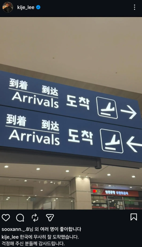 이기제는 4일 자신의 소셜 미디어(SNS) 계정을 통해 인천국제공항 입국장 안내판 사진과 함께 "한국에 무사히 잘 도착했습니다. 걱정해 주신 분들께 감사드립니다"라는 짧지만 진심 어린 메시지를 남겼다.