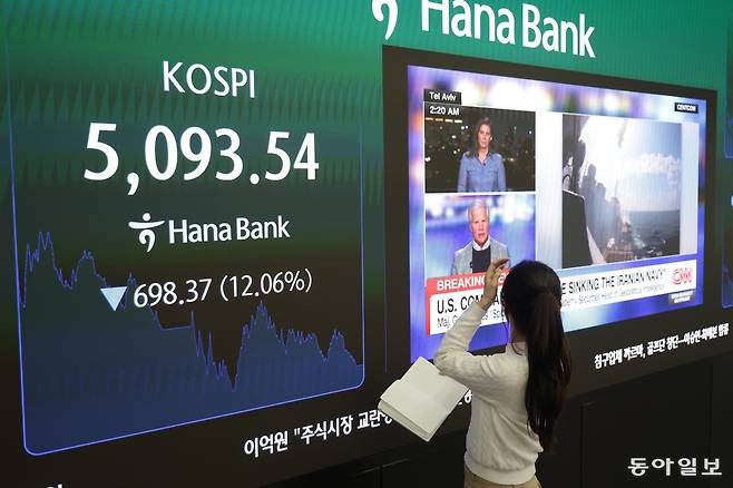 | 5000선도 위태위태 4일 서울 중구 하나은행 본점 딜링룸에 코스피 종가(5,093.54)가 표시돼 있다. 미국의 이란 공습 여파로 이날 코스피는 12.06%, 코스닥은 14% 하락하며 사상 최대 낙폭을 기록했다. 박형기 기자 oneshot@donga.com |