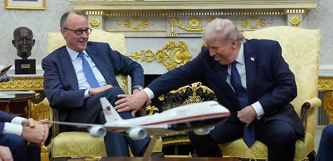 | 트럼프, 독일 총리와는 웃으며 대화 도널드 트럼프 미국 대통령(오른쪽)이 3일 워싱턴 백악관에서 프리드리히 메르츠 독일 총리와 대화하며 웃고 있다. 트럼프 대통령은 이날 이란 공습 과정에서 미군의 자국 내 기지 사용을 불허한 스페인을 향해 “교역을 중단하겠다”고 위협했다. 워싱턴=AP 뉴시스 |