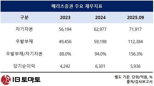 이 과정에서 메리츠증권은 일정 기간 해당 물량을 보유하는 구조를 택했고, 이에 따라 거래 초기에는 지급보증 성격의 노출이 우발부채로 반영됐다. 실질적인 현금 유출이 발생한 것은 아니지만, 계약상 책임 범위가 회계상 우발채무로 계상되면서 비율이 일시적으로 상승한 것이다. 메리츠증권의 우발부채/자기자본 비율은 2023년 말 88.0%, 2024년 말 94.0%에서 지난해 3분기 156.3%로 급격히 상승했다.
