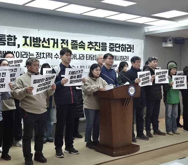 충남시민사회단체연대회(아래 단체)의는 4일 논평을 통해 "애초 행정통합 논의는 주민이 배제된 채 각종 특례와 권한 배분, 지방선거의 유불리를 둘러싼 정치적 이해관계의 장으로 전락해 있었다"라며 "시작부터 지금까지, 졸속으로 추진된 사안이 원만한 결과에 이를 리 없다"고 비판했다.