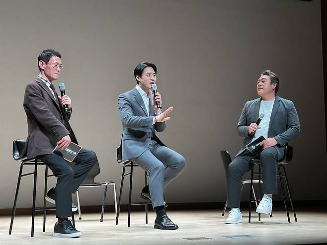 | ▲ 배우 이원종(오른쪽)과 방송인 노정렬(왼쪽)의 진행으로 한준호 의원이 패널들과 함께 진솔한 대화를 나누고 있다. |