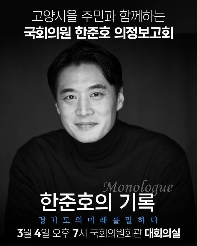 | ▲ 4일 오후 국회의원회관 대회의실에서 열린 한준호 의원 의정보고회 포스터. '한준호의 기록, 경기도의 미래를 말하다'라는 문구가 돋보인다. |