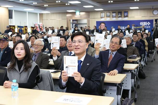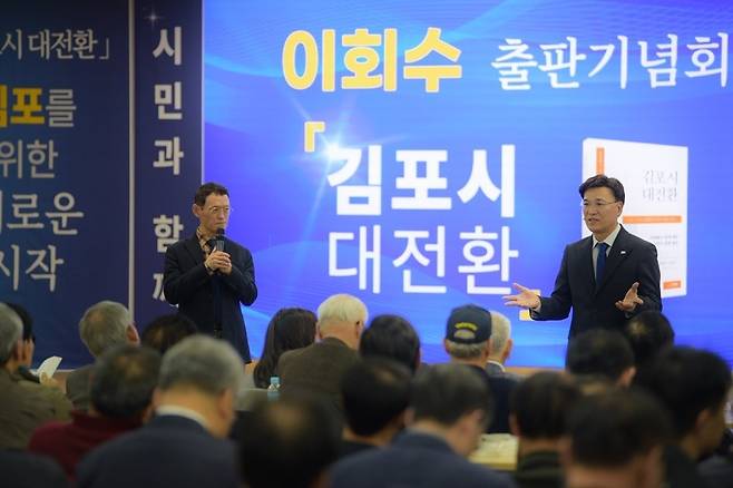 | ▲ 김포시장 출마를 준비 중인 이회수 전 더불어민주당 이재명 당대표 소통정책특보(전 경기교통공사 사장직무대행)이 28일 김포농협 본점 대강당에서 저서 <현장에서 시민과 함께 그려낸 '김포시 대전환'> 출판기념회를 열었다. |