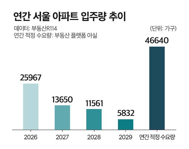 부동산 플랫폼 아실에 따르면 서울 연간 아파트 적정 수요량은 4만6640가구 수준이며 이를 향후 연간 평균 입주량인 1만4253가구와 비교하면 30%밖에 충족하지 못한다.
