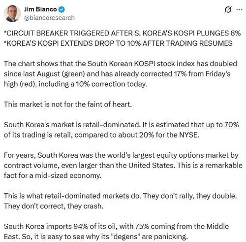 비앙코 대표는 4일(현지시간) 자신의 X에 '코스피, 서킷 브레이커 발동' 등의 속보를 언급하며 이같이 말했다.