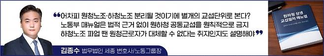 아마도 노동위원회에서는 원청 노조와 하청 노조 사이에 원칙적으로 교섭단위가 분리될 것이므로 이를 처음부터 별개의 교섭단위로 보는 것이 불필요한 교섭단위분리신청을 막고 노사간에 분쟁을 최소화하는 현실적인 대안이라고 생각했을지도 모른다. 그러나 이는 지극히 행정편의주의적인 발상에 불과하다.