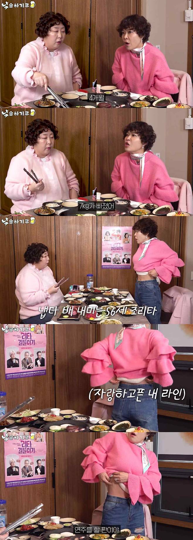 4개월 만에 총 7kg 감량에 성공한 조혜련은 돌연 '납작해진' 배를 자랑하기도 했다. 그는 웃옷을 위로 올리며 "갈비뼈가 보인다. 뒤 라인도 봐라. 대박이다. 연주를 할판이다. 너는 갈비뼈 본 지 꽤 오래되지 않았냐"고 말해 웃음을 자아냈다. 이에 신기루는 "통아저씨 같다"고 받아쳐 폭소를 더했다.