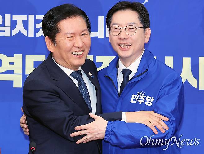| ▲ '3호 단수공천' 김경수 껴안은 정청래 정청래 더불어민주당 대표(왼쪽)가 5일 서울 여의도 국회에서 경남지사 후보로 단수공천된 김경수 지방시대위원장을 껴안고 있다. 우상호 강원도지사 후보, 박찬대 인천시장 후보에 이어 6·3 지방선거 더불어민주당 '3호 단수공천' 후보인 김 위원장이 환하게 웃고 있다. |