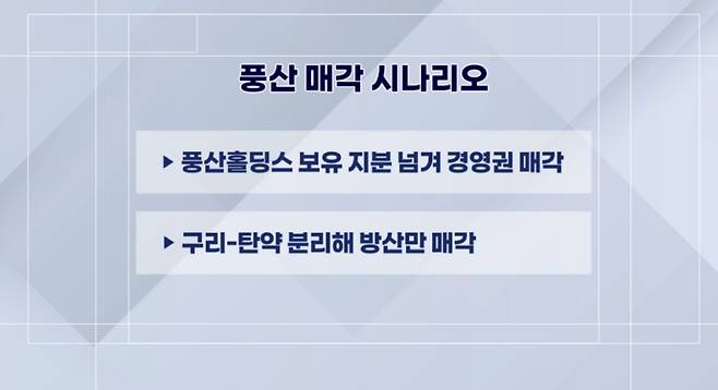 그러자 일각에서는 풍산홀딩스가 보유한 풍산 지분 38%를 넘겨 경영권을 내주는 게 아니라 풍산의 구리와 탄약을 분리해 방산만 팔려고 한다는 관측이 제기되고 있습니다.