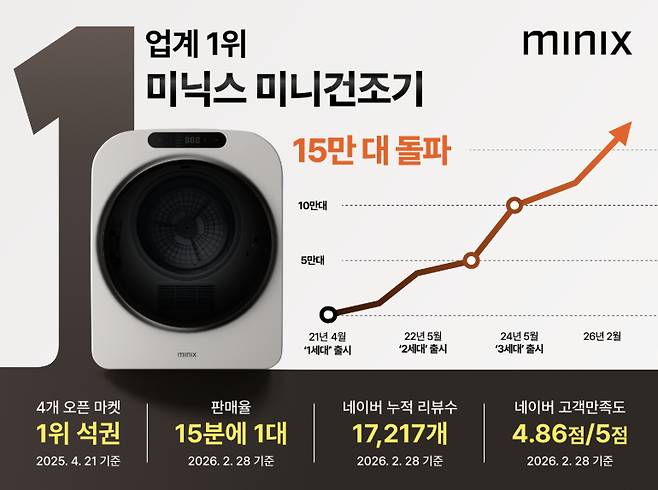 미닉스 '미니건조기'는 2021년 4월 첫 출시된 이후 브랜드를 대표하는 제품으로 자리 잡았다. 이후 출시 4년 10개월 만에 누적 15만8000여대 판매를 기록했다.