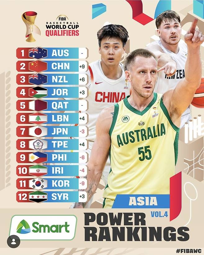 FIBA(국제농구연맹)는 5일(한국시간) 공식 홈페이지를 통해 2027 FIBA 농구 월드컵 아시아 예선 4번째 파워랭킹을 발표했다. 지난달 26일부터 1일까지 펼쳐진 윈도우-2 성적을 바탕으로 참가국들의 순위를 매겼다.