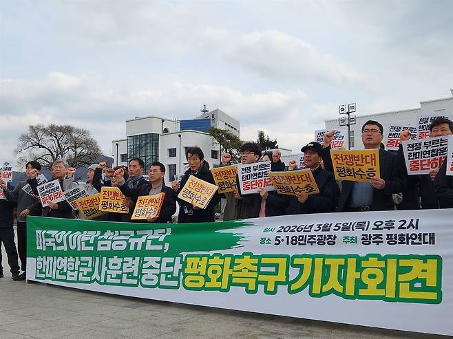 광주평화연대가 5일 오후 2시 5.18민주광장에서 미국의 이란 침공을 규탄하고 상반기 한미연합훈련 중단을 촉구하는 기자회견을 열었다.