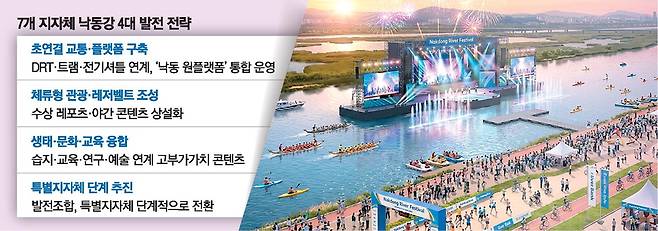 이번 발전 전략은 낙동강 하류가 그동안 행정 경계와 규제에 가로막혀 '단절된 강'에 머물렀다는 진단이 출발점이다. 이번 전략의 핵심은 그 단절을 '연결'로 바꾸는 데 있다. 제도와 교통, 콘텐츠, 서비스를 하나의 플랫폼으로 묶어 '공동체 기반 수변 중심 도시'로 전환하는 게 골자다.