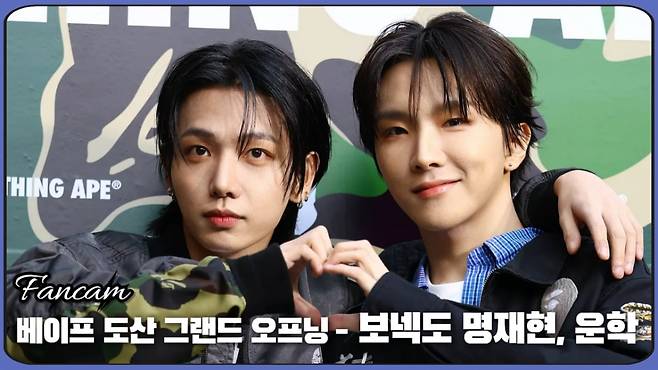그룹 보이넥스트도어 명재현, 운학이 4일 오후 서울 신사동 베이프 도산에서 열린 '베이프 도산 그랜드 오프닝' 기념 포토행사에 참석해 포즈를 취하고 있다.