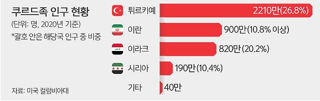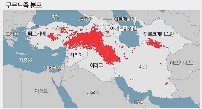 이후 쿠르드족 거주지도 분리됐다. 이들은 각국의 소수민족으로 박해와 탄압을 견디면서도 강한 민족 정체성을 유지해 왔다. 2020년 기준 쿠르드족 인구는 약 4500만명 규모로 튀르키예(2210만명), 이란(900만명), 이라크(820만명), 시리아(190만명) 등에 흩어져 살고 있다. 튀르키예는 쿠르드족을 ‘산악 튀르키예인’이라 부르며 언어 사용 금지, 쿠르드식 이름 금지 등 동화정책을 폈고, 이란은 억압했다.