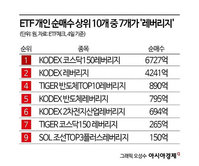 6일 코스콤 ETF체크에 따르면 코스피 지수가 12.06% 하락한 4일 개인 순매수 상위종목 10개 중 7개는 레버리지 ETF가 차지했다. 1위는 KODEX 코스닥150레버리지로 개인이 6727억원 사들였다. 2위인 KODEX 레버리지는 4241억원 사들이며 두 상품에 1조원이 넘는 자금이 몰렸다. 전날 수익률이 각각 -27.72%, -24.35%를 기록했는데도 개인들은 '사자'를 택했다.