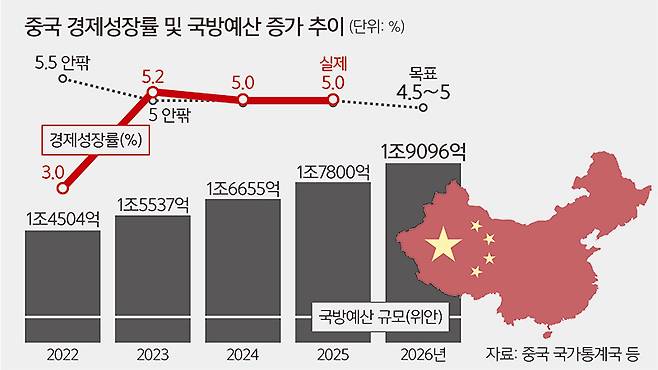 증가율 자체는 2023∼2025년 유지해 온 7.2%보다 0.2%포인트 소폭 줄었지만 여전히 5년 연속 7%대 증액 기조를 이어갔다. 국방비 증가율은 2020년 6.6%로 둔화되기도 했으나 ‘건군 100주년(2027년) 분투 목표’가 설정된 뒤 2021년부터 줄곧 7% 안팎의 높은 성장세를 유지하고 있다.
