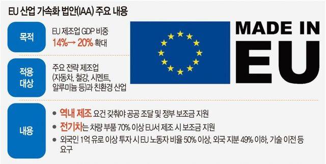 EU 집행위원회는 4일(현지시간) 유럽의 제조업 경쟁력 강화를 위한 산업 가속화 법안(IAA)을 발표했다. 자동차, 철강, 시멘트, 알루미늄 등 전략 산업과 풍력 등 친환경 산업의 유럽 내 생산을 확대한다는 게 골자다. 이를 통해 역내 국내총생산(GDP)의 제조업 비중을 14%에서 20%로 끌어올릴 계획이다.