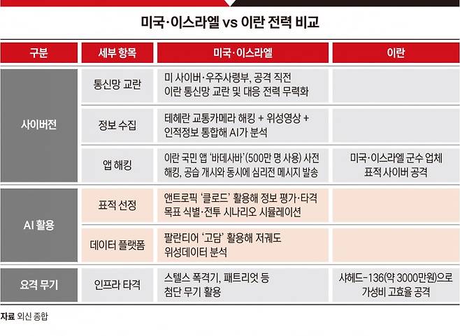 이란 공습은 전쟁의 판도 변화를 보여준다. AI와 통신망을 활용한 사이버 전력이 승패를 갈랐고 자폭 드론 등이 새로운 전력으로 떠올랐다. 미국과 이스라엘은 공습 이전에 방대한 데이터를 모아 적의 정보를 낱낱이 파헤쳤고 AI를 동원해 전략을 짰다.