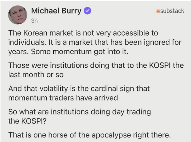 버리는 "한국 증시는 (한국 이외 지역의) 개인 투자자들이 접근하기에 쉽지 않고 수년간 외면받아온 시장인데 최근 모멘텀이 붙기 시작했다"라고 이날 뉴스레터 플랫폼 서브스택에 글을 올렸다.