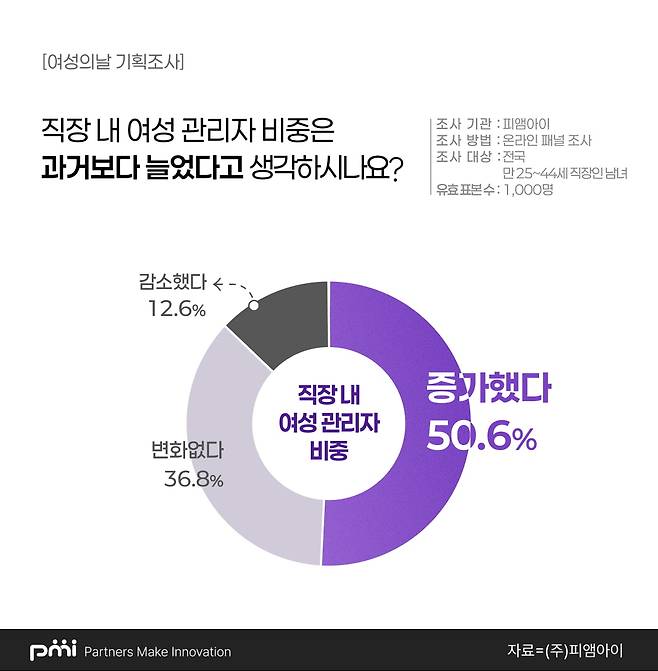직장인 절반 이상이 여성 리더 확대가 조직 경쟁력 향상에 긍정적인 영향을 미칠 수 있다고 인식하는 것으로 나타났다. 데이터 컨설팅 기업 피앰아이(PMI)는 세계 여성의 날(3월 8일)을 앞두고 만 25~44세 직장인 1,000명을 대상으로 ‘성별과 리더십 인식’을 조사한 결과, 응답자의 50.9%가 여성 리더 확대가 조직 성과와 경쟁력에 긍정적인 영향을 미친다고 답했다고 6일 밝혔다.