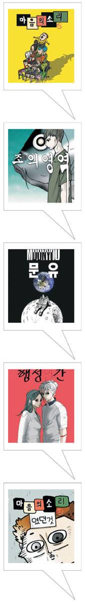 “단순해요. 서사물을 그리고 싶다는 생각이 들면, 그걸 그리는 거예요. 제 행보를 좋게 포장해주시는 분들은 ‘조석이 개그 만화로 돈을 벌 만큼 다 벌더니 이제는 마이너한 만화를 그리는구나’ 하고 칭찬해주시기도 해요. 하지만 제가 ‘조의 영역’을 그릴 때 ‘이걸 연재하고 싶으니까 마음의 소리를 한 편 줄여야지’ 하고 아주 담백하게 생각했거든요. ‘행성인간’을 그릴 때는 그런 생각도 했어요. ‘이걸로 돈을 많이 벌어야지. 정말 모든 사람이 좋아해 줄 거야.’”